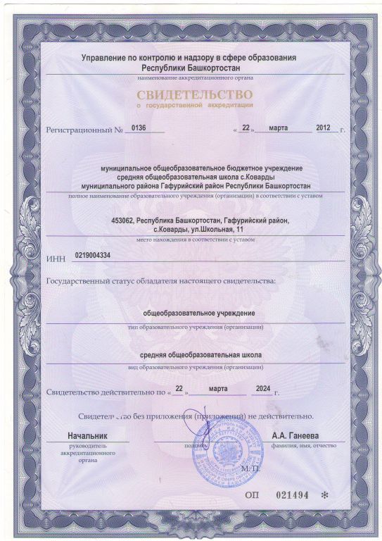 | Полное наименование образовательной организации* | Муниципальное общеобразовательное бюджетное учреждение средняя общеобразовательная школа имени заслуженного учителя школы РСФСР Гариповой Назафат Халиловны с.Коварды муниципального района Гафурийский район Республики Башкортостан |